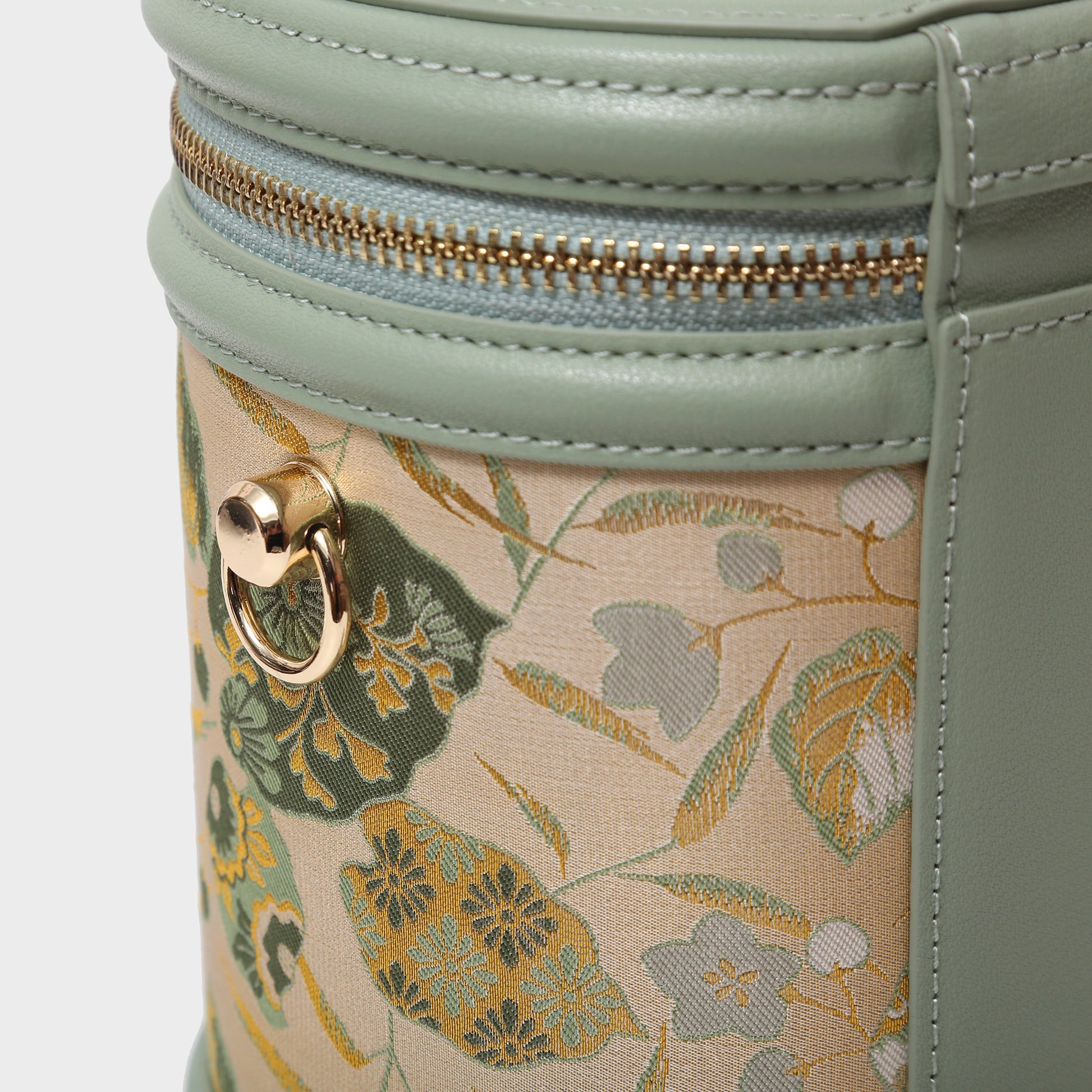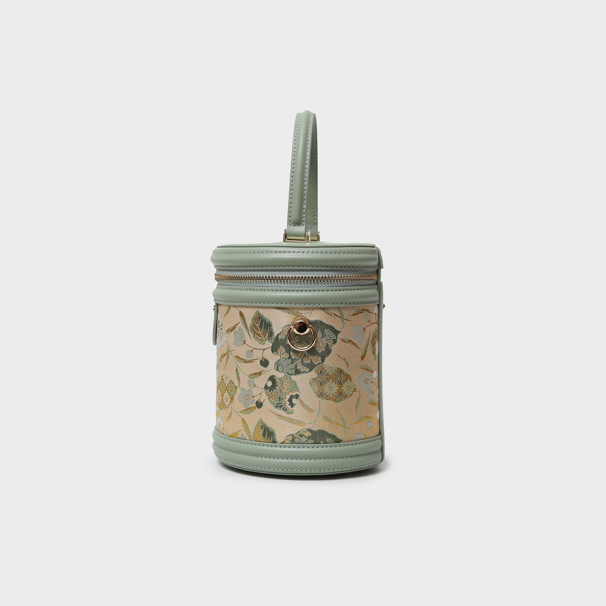 This handmade handbag is crafted from Song brocade (an intangible cultural heritage fabric), featuring a soft apricot base paired with the elegant "Golden Branches & Jade Leaves" pattern—infusing the gentle charm of traditional Chinese florals into its cylinder frame. The intricate weave of Song brocade, combined with mint-green leather trim, balances the luxury of traditional Chinese brocade bags with a soft, everyday vibe.