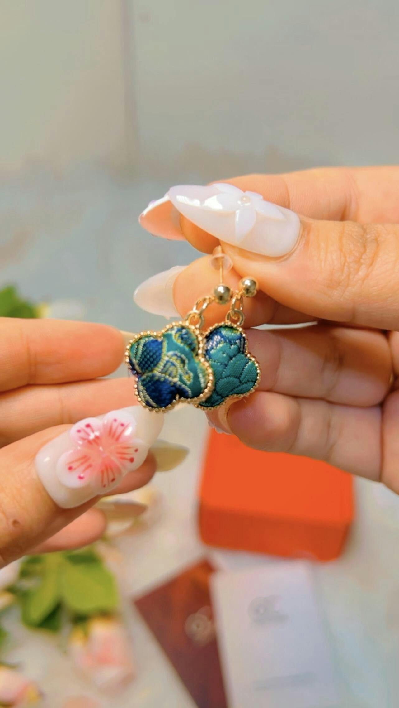 Inspired by traditional Chinese aesthetics and the eco - friendly concept, these clover - leaf - shaped earrings are a wonderful combination of uniqueness and sustainability. Crafted from the leftover brocade fabric of other projects, each pair showcases the unpredictable charm of the fabric's colors and patterns. Just like the rare four - leaf clover in nature, every earring is one - of - a - kind, bringing good luck and a touch of Eastern elegance. They are suitable for various occasions such as speeches, attendances, dinners, graduation seasons, Mother's Day, Valentine's Day, birthdays, and anniversaries. They can also be a thoughtful gift for environmental advocates, a standout item for travel photos, and an accessory to add cultural and unique elements to daily outfits.