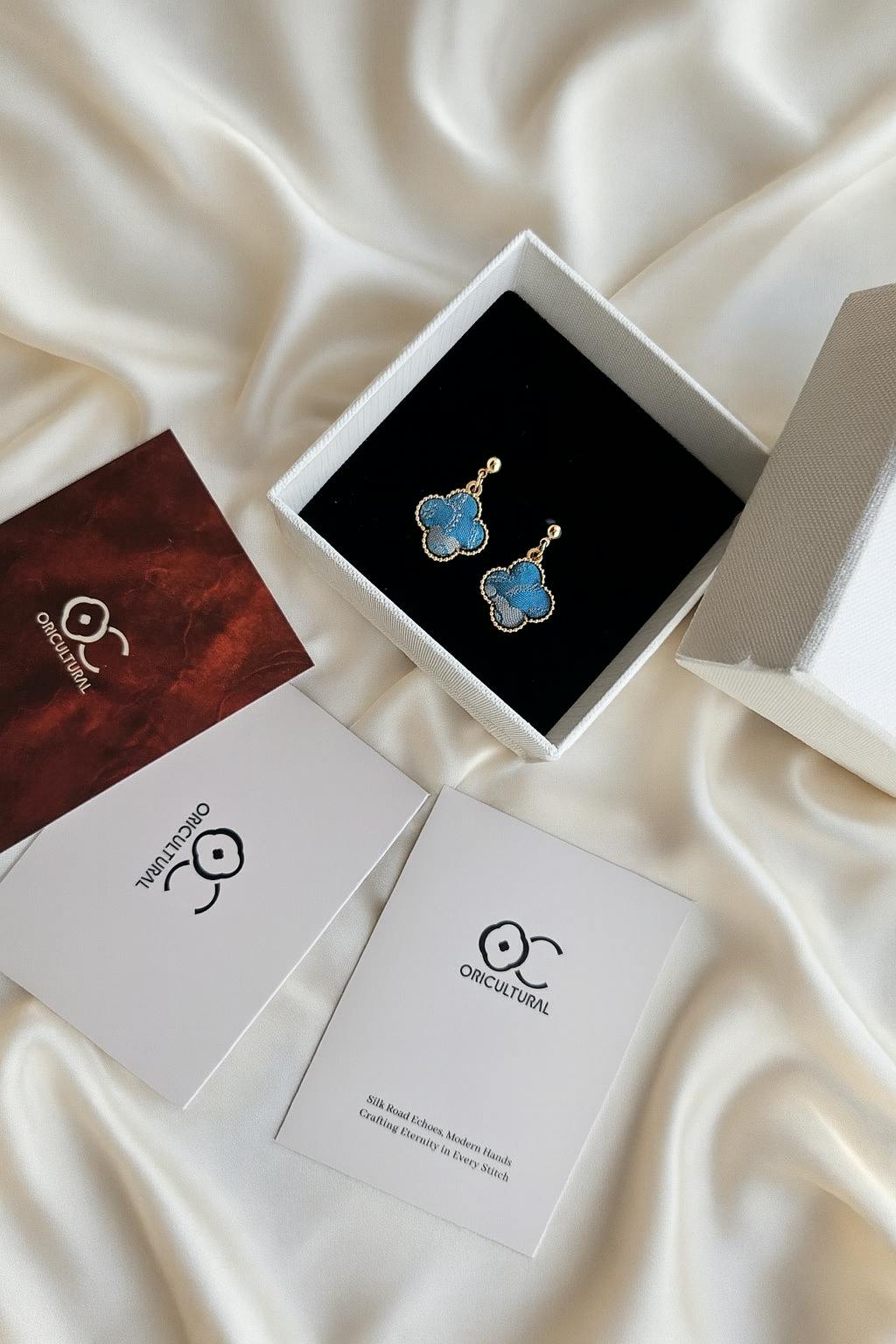 These earrings are painstakingly handmade from upcycled brocade. The brocade, a classic Chinese textile, is given new life through this creative upcycling. Artisans carefully transform the brocade scraps into delicate clover - leaf shapes, retaining the natural irregularities of the fabric. Due to the handmade process and the uniqueness of the brocade, there may be differences between the actual product and the display images.