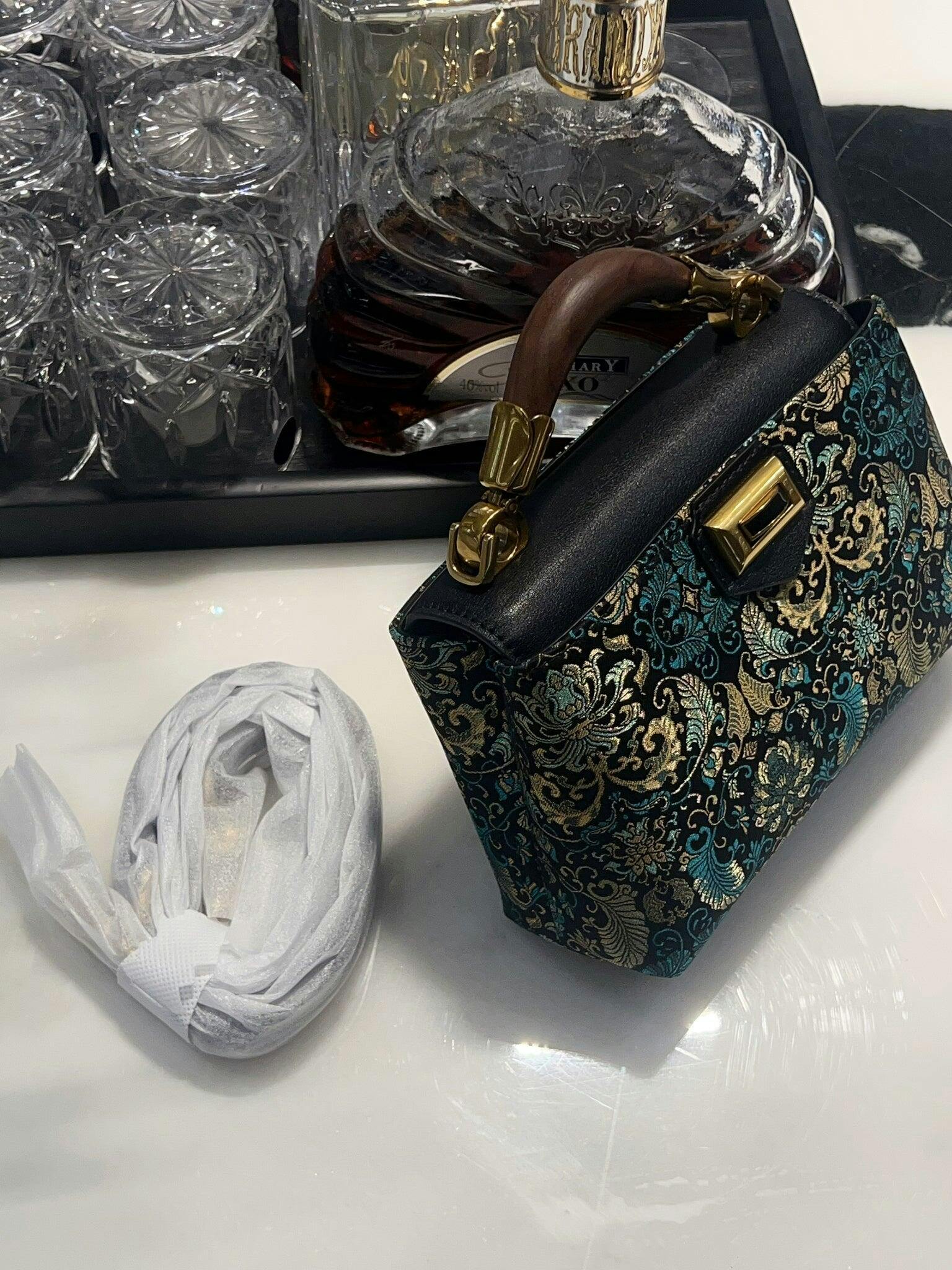 This bag is a high - end evening bag designed by Oricultural. It combines classic and luxury elements. Crafted with royal silk and handmade, each bag is unique and non - reproducible. The combination of gold and turquoise is both gorgeous and elegant, exuding a strong retro court charm and fully showcasing Eastern Elegance. As a designer handbag, it has extremely high collectible value.
