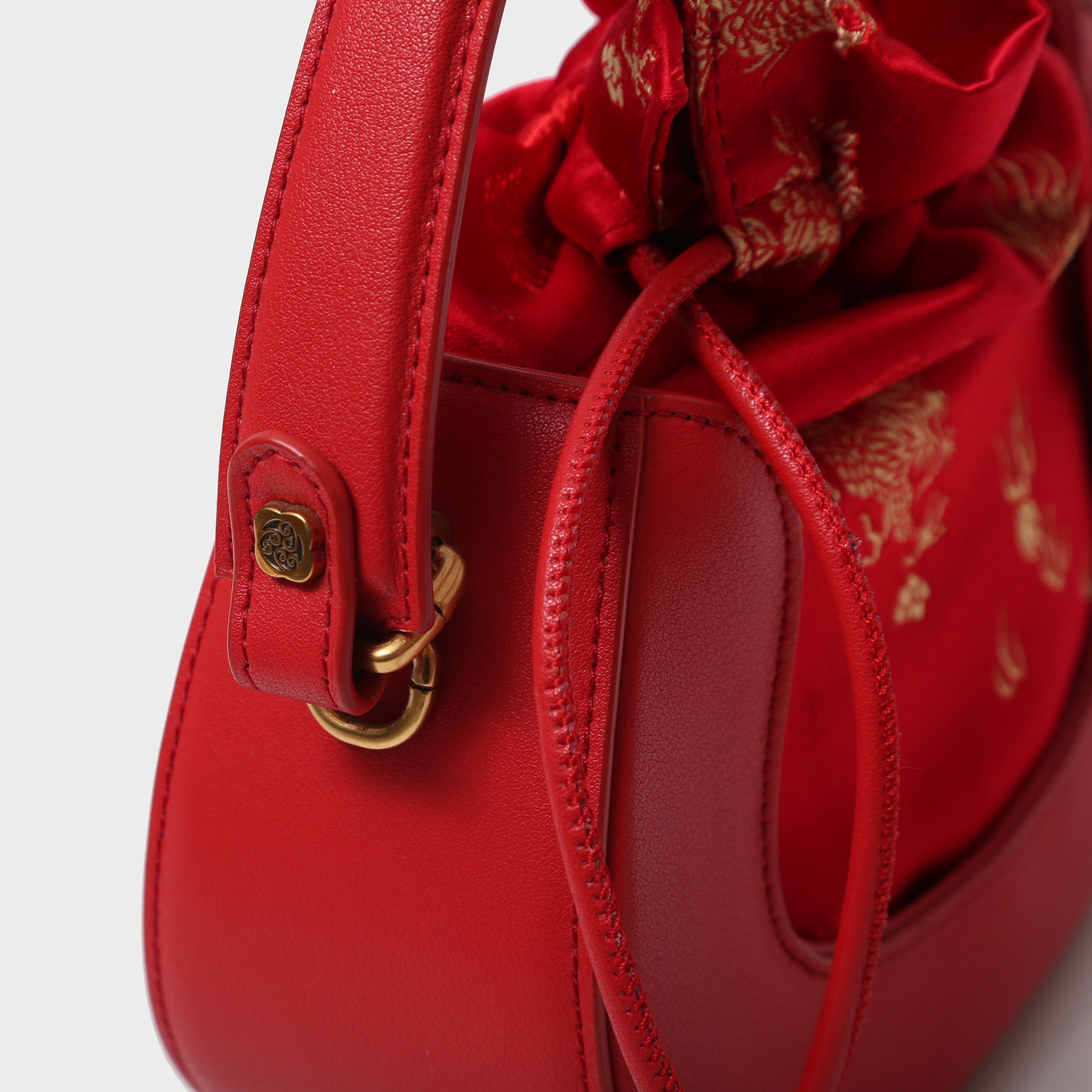 Designed as a vintage crescent bag, it includes a drawstring closure and leather handle, merging the cultural charm of intangible cultural heritage fabric bags with on-the-go convenience. Its compact interior fits essentials like phones, keys, and lipsticks, making it a festive choice for everyday carry.