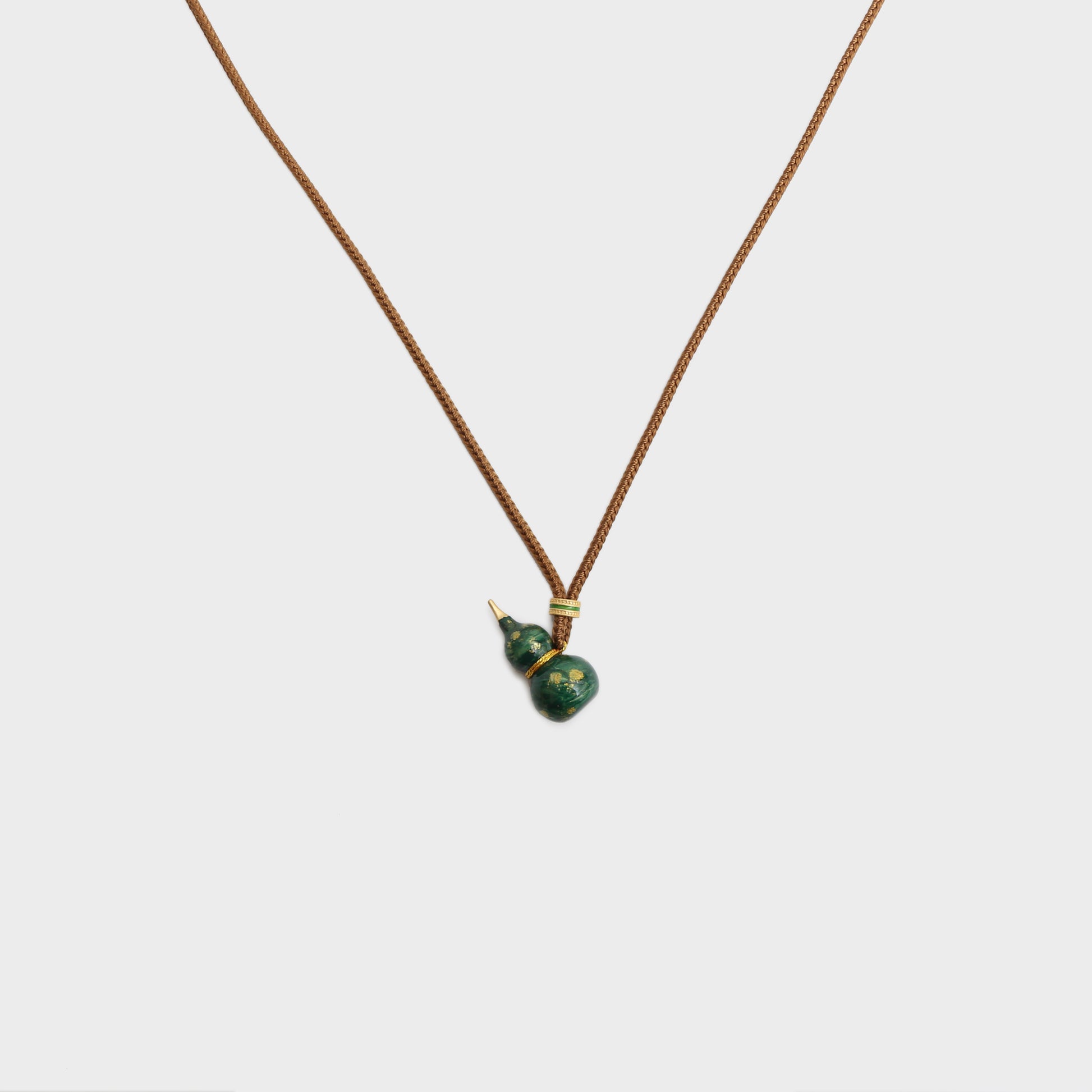 This necklace is a brilliant fusion of traditional charm and modern elegance, featuring a brass gourd pendant. The gourd, a symbol of good fortune and abundance in Chinese culture, is finished in a rich green hue with golden speckles, exuding an air of sophistication and cultural depth.