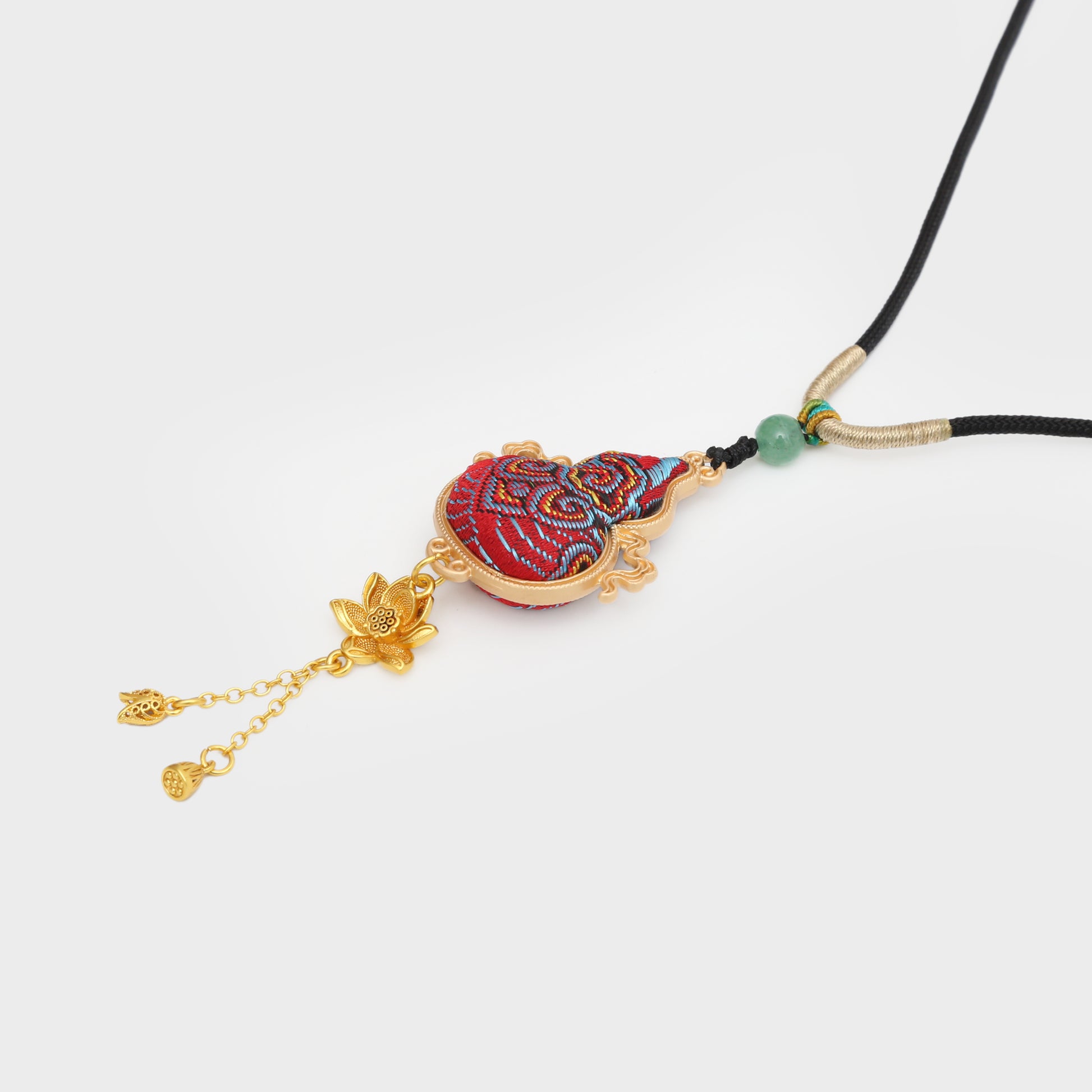 This necklace is a magnificent fusion of traditional art and modern design, featuring a brass gourd pendant adorned with a delicate lotus charm. The gourd, a symbol of good fortune and prosperity in Chinese culture, is embellished with intricate Song brocade patterns in vibrant red and blue, complemented by golden brass detailing and a dangling lotus charm, showcasing rich cultural connotations and exquisite craftsmanship.