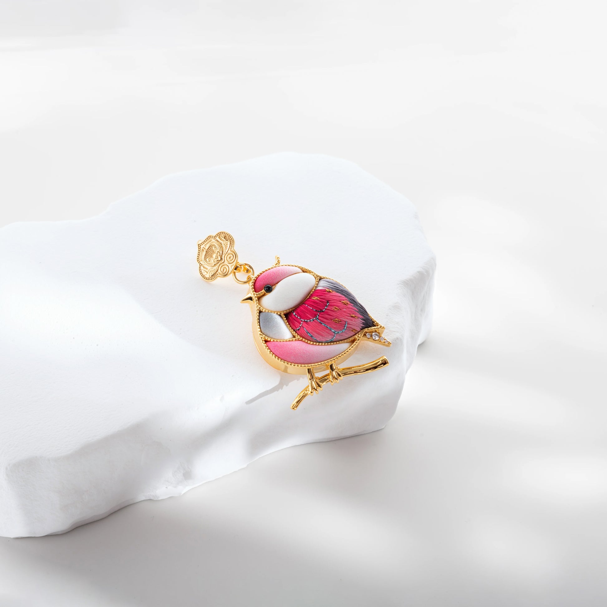 This handmade bird brooch is crafted from fine silk and delicately embroidered using traditional Su embroidery techniques. The silk frog button adds a classic Chinese detail. Can be worn as a brooch, lapel pin, or pendant — a versatile piece celebrating elegance and craftsmanship.